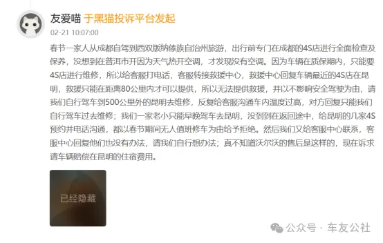 另有车主春节从成都自驾西双版纳,出行前做过全面检修,却在普洱出现空调故障,官方以救援仅限 80 公里、故障不影响安全为由,让车主自行开 500 公里到昆明维修,驱车前往后,昆明多家 4S 店又以春节无人值班拒修,客服也表示无能为力,车主要求赔偿昆明住宿费用,至今无回应。