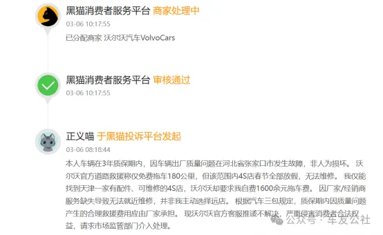 除了被车主们诟病的质量问题外,车友公社在黑猫投诉平台发现,关于其售后的缺位投诉也不在少数。一位车主反映自己的的车在河北张家口因出厂质量问题出故障,官方免费拖车范围的 4S 店春节放假无法维修,仅天津有 4S 店可修,沃尔沃却要求车主自费 1600 余元拖车费,车主按三包规定要求厂家承担合理费用,诉求遭客服推诿。