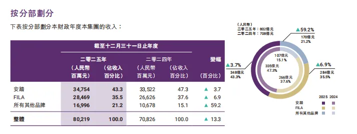 此外,多品牌矩阵的阶段性成效,进一步凸显安踏的经营韧性。财报披露的“所有其他品牌”板块表现最具爆发力,营收达170.0亿元,同比激增59.2%。