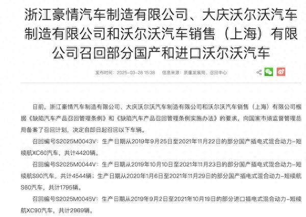 3月28日下午,国家市场监督管理总局发布召回信息,其中浙江豪情汽车制造有限公司、大庆沃尔沃汽车制造有限公司和沃尔沃汽车销售(上海)有限公司根据《缺陷汽车产品召回管理条例》和《缺陷汽车产品召回管理条例实施办法》的要求,决定自即日起共计召回汽车13728辆。