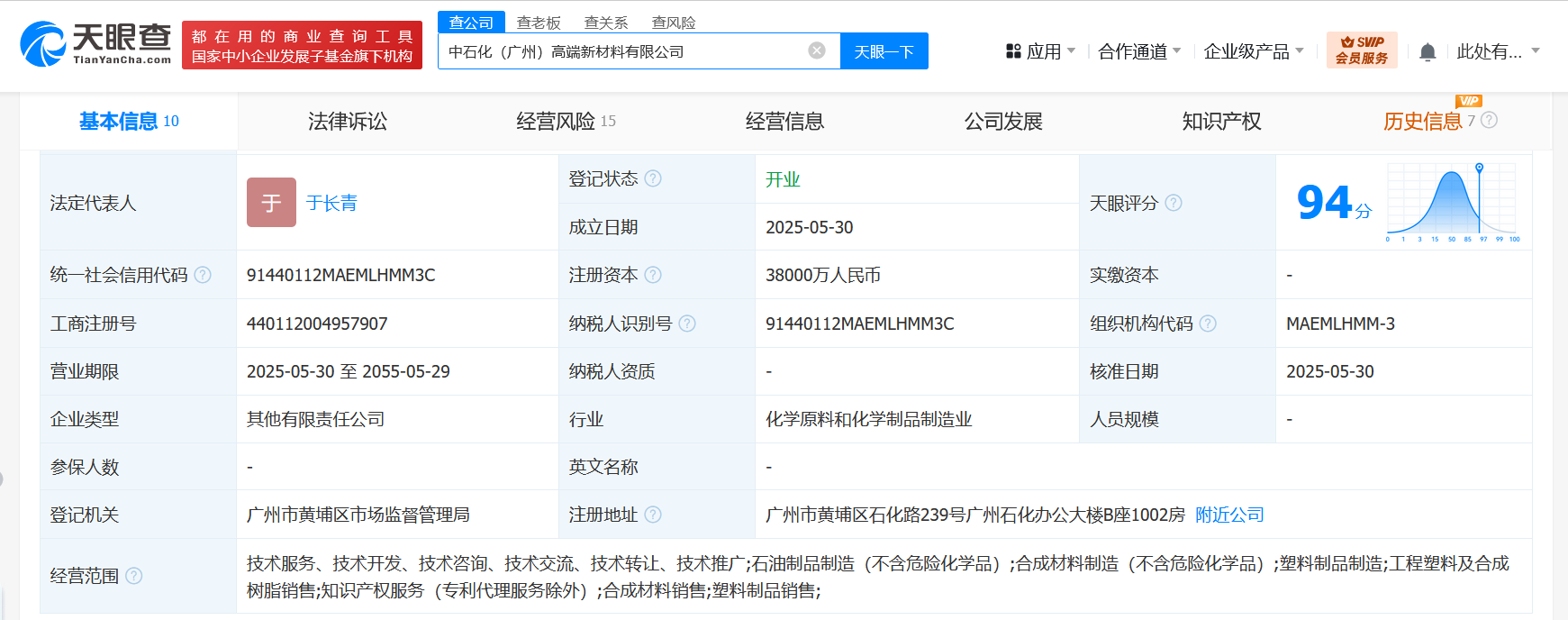 天眼查App显示,近日,中石化(广州)高端新材料有限公司成立,法定代表人为于长青,注册资本3.8亿人民币,经营范围含石油制品制造、合成材料制造、塑料制品制造、工程塑料及合成树脂销售、知识产权服务等。