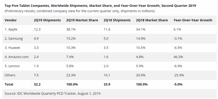随著智能手机屏幕尺寸越来越大,平板电脑的受欢迎程度已经大不如前,不过平板电脑的市场对厂商来说仍然相当重要。根据知名市场调查公司IDC的最新公布数字显示,在2019年第二季,全球的平板电脑出货数字仍然多达3220万部,一如以往,iPad 继续稳坐平板市场一哥的宝座。