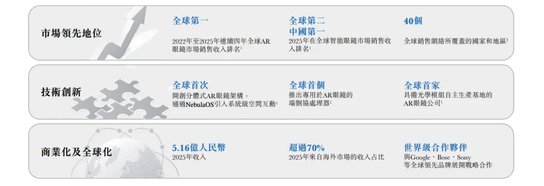 根据招股文件,XREAL在2022年至2025年间连续四年在全球AR眼镜市场销售收入排名中位居第一,2025年更是在更广泛的智能眼镜市场中位列全球第二、中国第一。