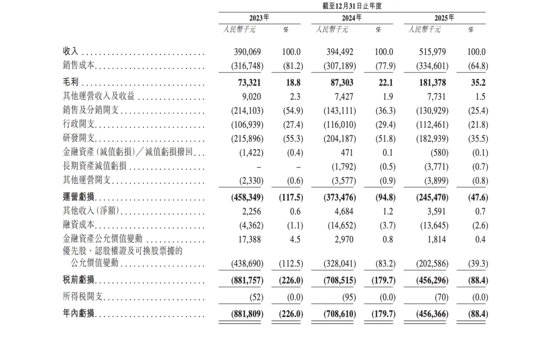 招股书将亏损主要归因于三方面: 优先股、认股权证及可转换票据的公允价值变动(2025年仍达2.03亿元)、持续的研发投入(2025年为1.83亿元,占收入35.5%),以及全球市场教育及渠道建设相关的销售及分销开支(2025年为1.31亿元)。值得注意的是,运营开支总额占收入的比例已从2023年的137.6%大幅下降至2025年的82.7%,显示出运营杠杆的改善。