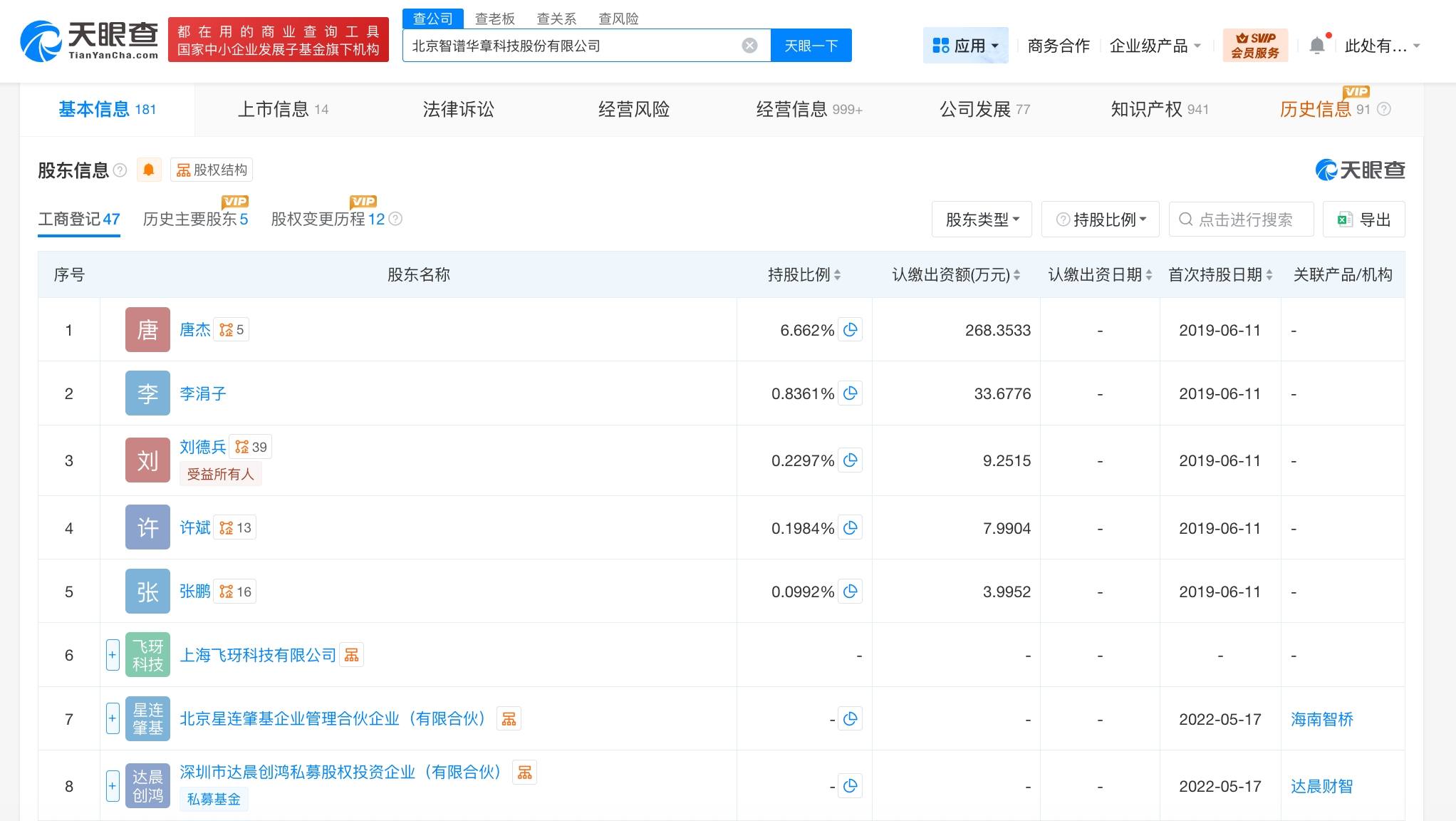 天眼查工商信息显示,北京智谱华章科技股份有限公司成立于2019年6月,法定代表人为刘德兵,注册资本约4028万人民币,经营范围含人工智能基础软件开发、人工智能应用软件开发、数据处理和存储支持服务、数据处理服务、信息技术咨询服务、人工智能理论与算法软件开发、大数据服务等。股东信息显示,该公司由唐杰、李涓子、上海飞玡科技有限公司等共同持股。对外投资信息显示,该公司直接持股26家企业,其中24家为存续状态,包括天津智谱华章科技有限公司、北京星连鼎森股权投资基金合伙企业(有限合伙)、上海智谱寰宇科技有限公司、北京豆神智创科技有限公司等。