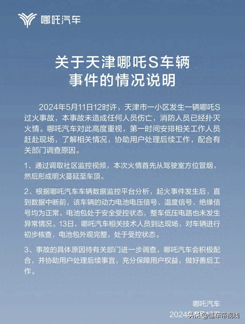 [懂车帝原创 行业] 5月13日,针对天津哪吒S起火事故,哪吒汽车回应称,通过调取社区监控视频,本次火情首先从驾驶室方位冒烟然后形成明火蔓延至车顶。根据哪吒汽车车辆数据监控平台分析,起火事件发生后,直到数据中断前,该车辆的动力电池电压信号、温度信号、绝缘信号均为正常,电池包处于安全受控状态,整车低压电路也未发生异常情况。