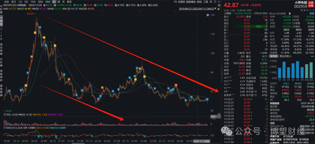 没有什么能比亮眼的业绩更能打动投资者,小熊电器惨淡的业绩表现自然遭到资本市场用脚投票。截至2025年4月11日收盘,小熊电器股价报42.87元/股,不仅年内累计下跌超10%,更是较2020年最高点156.68元/股跌去超七成,延续了此前年K线四连跌的颓势,市值大幅缩水,目前仅67亿元。