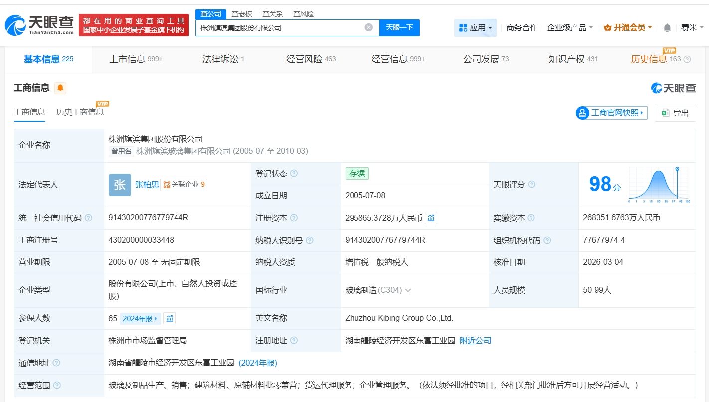 株洲旗滨集团股份有限公司成立于2005年7月,法定代表人为张柏忠,经营范围包括玻璃及制品生产、销售,建筑材料、原辅材料批零兼营等。股东信息显示,该公司由俞其兵、福建旗滨集团有限公司、香港中央结算有限公司等共同持股。