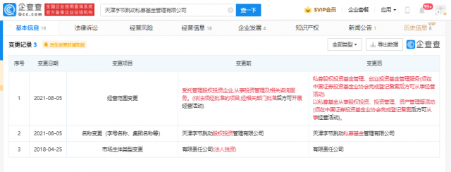 【TechWeb】企查查APP显示,8月5日,原天津字节跳动股权投资管理有限公司发生工商变更,正式更名为天津字节跳动私募基金管理有限公司,同时经营范围变更为私募股权投资基金管理、创业投资基金管理服务;以私募基金从事股权投资、投资管理、资产管理等活动。