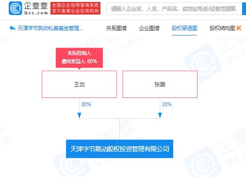 企查查信息显示,天津字节跳动私募基金管理有限公司成立于2018年3月,注册资本1000万人民币,法定代表人为余炜奇。企查查股权穿透显示,该公司现由王剑、张鹏共同持股。