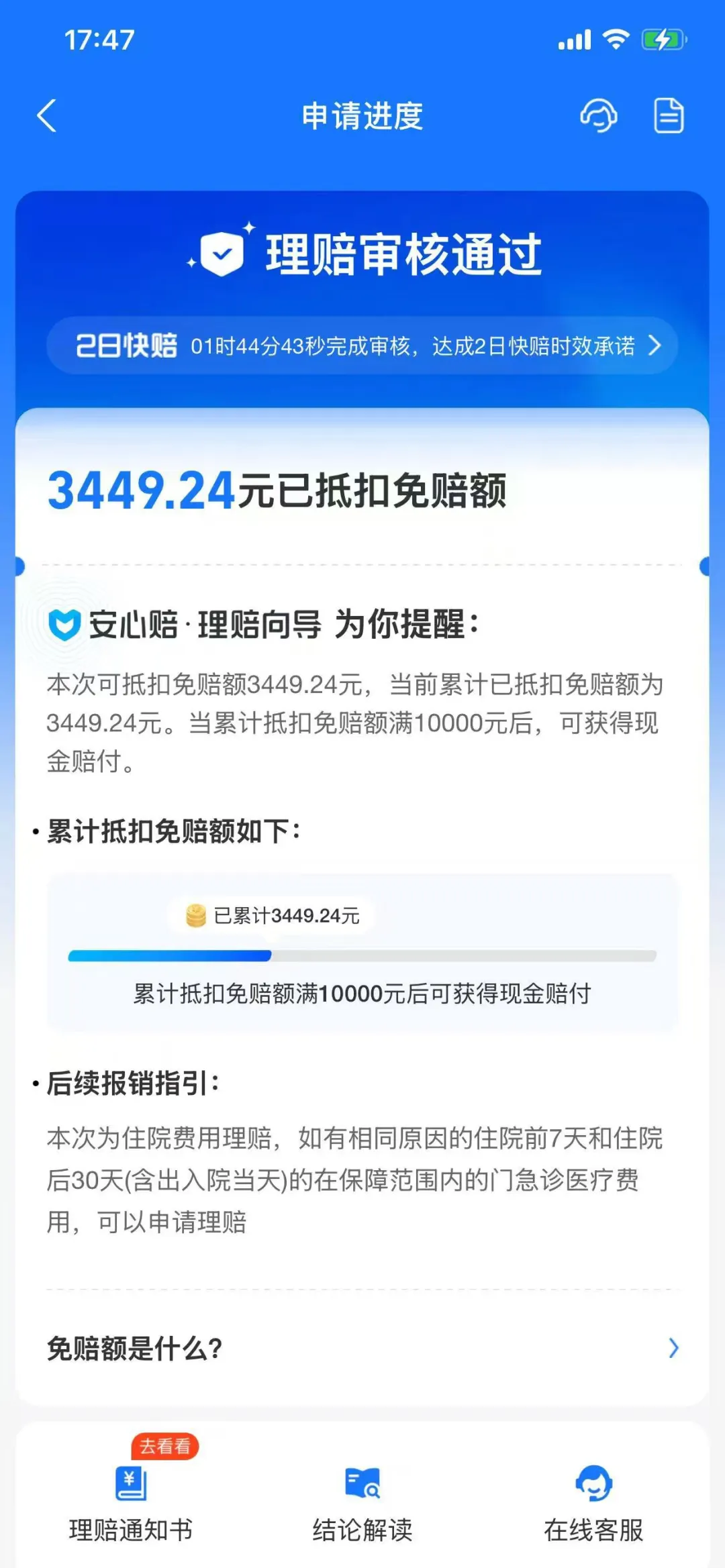 其中,笔者我就亲身体会了更深的套路,我老婆几年前在支付宝上被“首月0元·最高600万医疗保障”的广告吸引,点击投保后,系统默认勾选了“自动续费”,连续多年来在支付宝平台上购买了健康医疗保险,直到最近手术住院需要报销的时候才查看近年来的保单费用,账单显示保费骤增至了305元。由于最近手术住院,抱着试一试的心理申请理赔,没想到上面显示理赔审核通过,但需要累计抵扣免赔额满一万元后可获得现金赔付,文字游戏被蚂蚁保玩到了极致,估计是理赔拒赔坑了太多的消费者,现在玩起来新的电商文字套路,只要定语条件加的多,我可以赔,就是不赔现金。