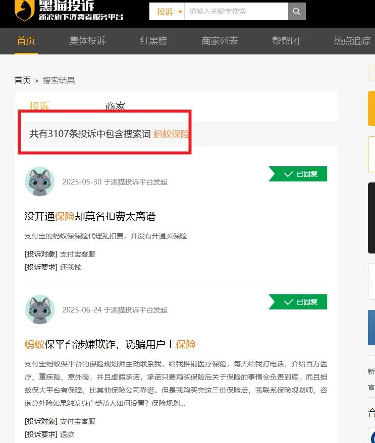 蚂蚁保险,作为依托于强大的互联网平台的产物,本应凭借其便捷性和创新性,为广大消费者带来更优质的保险服务体验。然而在黑猫投诉平台上,关于“蚂蚁保险”的投诉量已超3107条,关键词集中在“虚假宣传诱骗买保险”“自动续费”“理赔拒赔”三大领域。