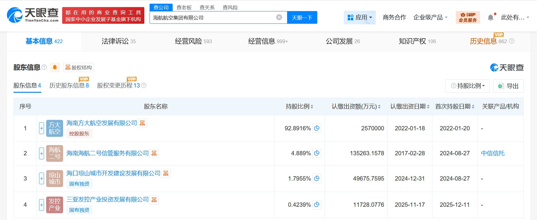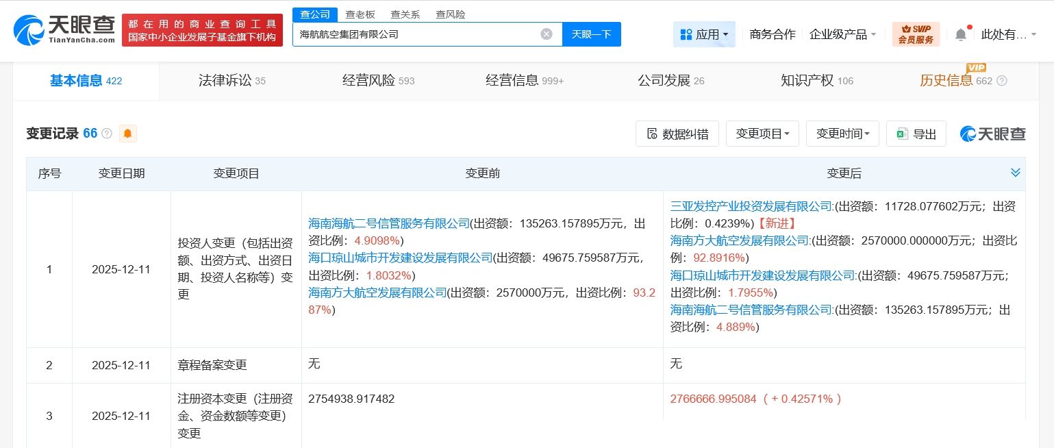 天眼查工商信息显示,近日,海航航空集团有限公司发生工商变更,新增三亚发控产业投资发展有限公司为股东,同时,注册资本由约275.5亿人民币增至约276.7亿人民币。