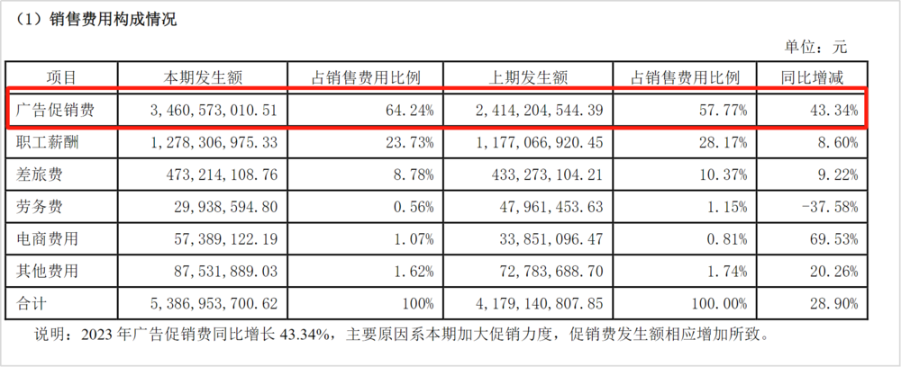 从2023年财报的销售费用明细中可以看到,洋河大量的销售费用主要来自广告促销费的大幅上升。