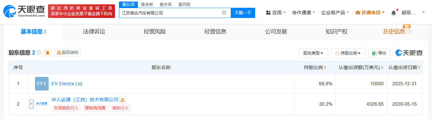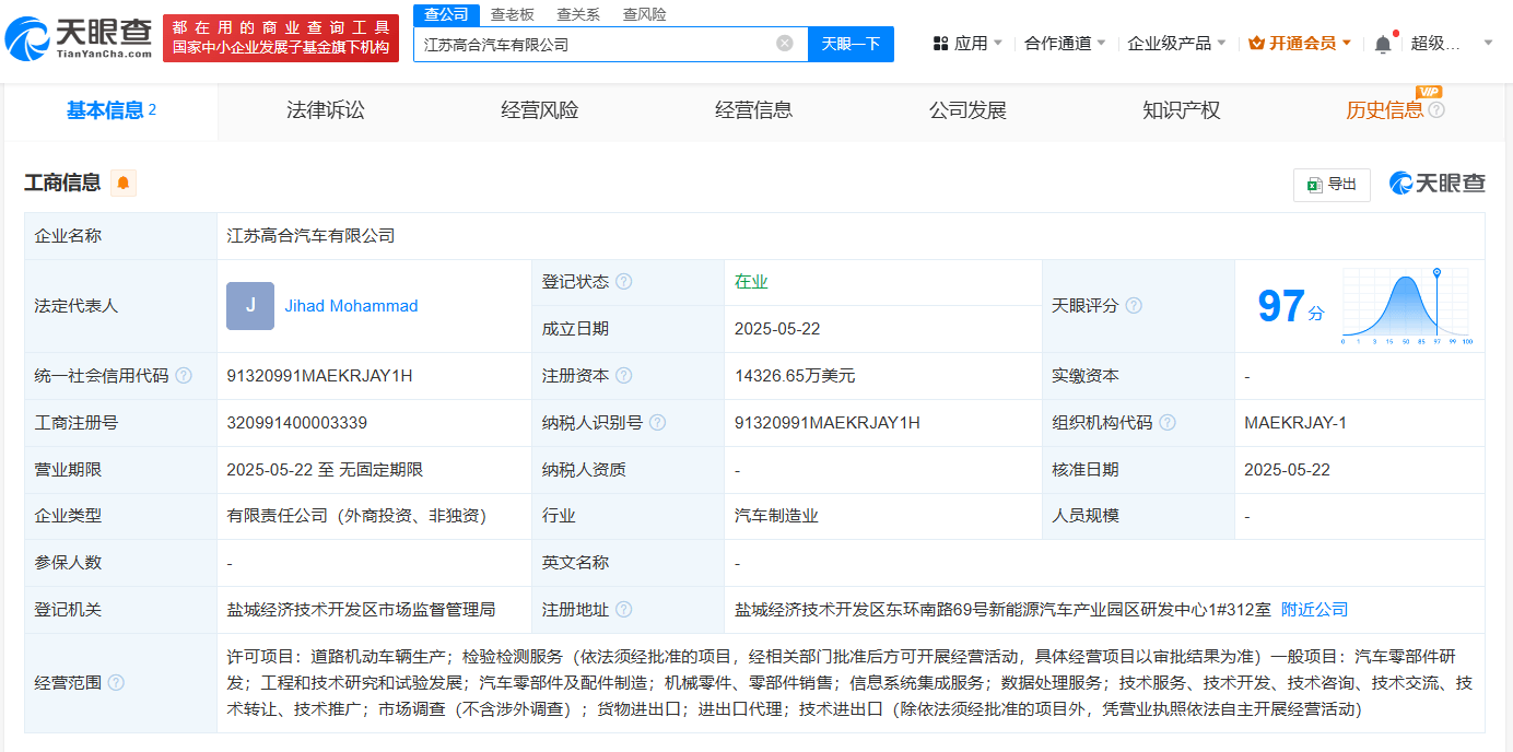 天眼查App显示,5月22日,江苏高合汽车有限公司成立,法定代表人为Jihad Mohammad,注册资本约1.43亿美元,经营范围包括道路机动车辆生产、汽车零部件研发、工程和技术研究和试验发展等,由EV Electra Ltd.和华人运通(江苏)技术有限公司共同持股。