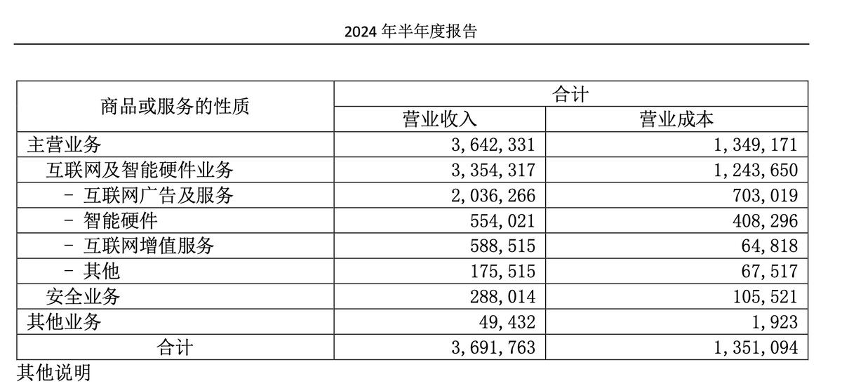 今天的三六零财报里分为互联网及智能硬件服务和安全业务。