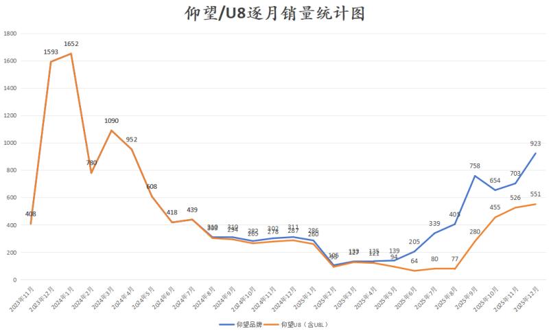 2025年,整个仰望U8系列(U8、U8L)累计销量为2728辆,同比暴跌62%。而在该车的上市初期,仰望U8曾连续两个月,单月销量突破1500辆。2023年12月,仰望U8销量1593辆,2024年1月,仰望U8销量为1652辆,毫无疑问,仰望品牌以及仰望U8的表现算得上“开局即巅峰”。