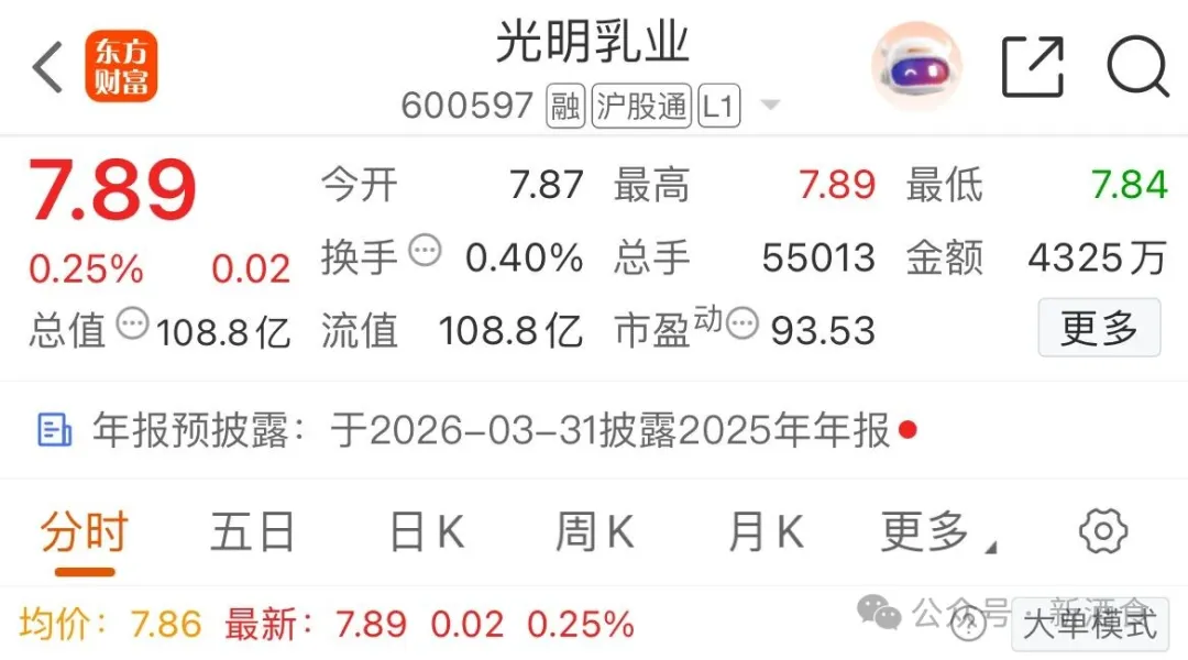 截至2026年3月11日,光明乳业市值约108.8亿元,反而远低于营收不及自身的新乳业(约171.1亿元)。