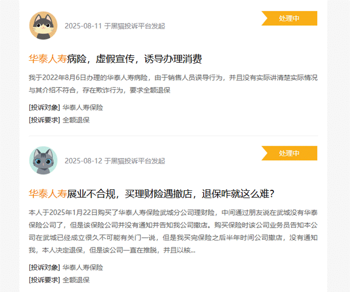 与此同时,黑猫投诉平台上关于华泰人寿的争议不断。有用户投诉称,2022年购买疾病保险时,因销售人员误导宣传且未充分说明条款细节,存在销售欺诈行为,要求全额退保。此类投诉不仅涉及虚假宣传、违规销售等问题,也在不断侵蚀着公司的品牌公信力。