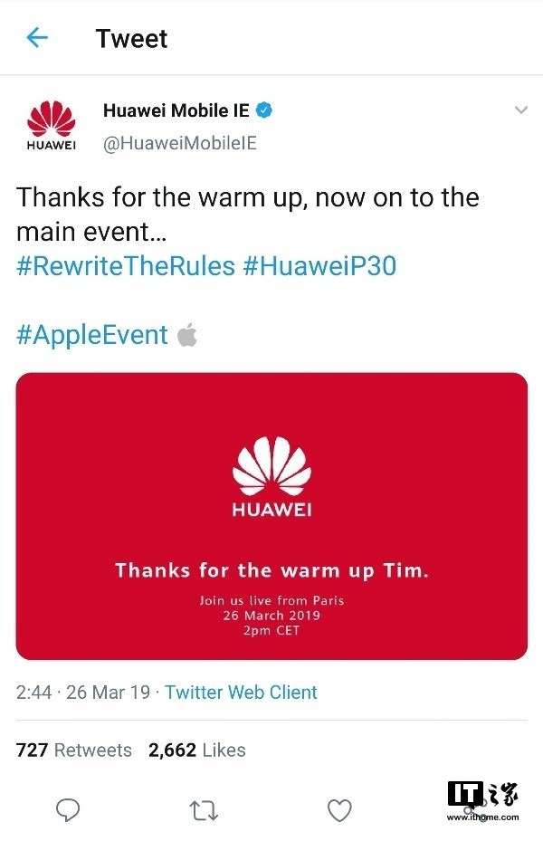 华为官方在深夜发了一条推特,大致是对苹果发布会的简单评价,其表示,感谢暖场,现在主要活动开始了,并附上了一张图片,不难明白这是在宣传自家P30系列的发布会。