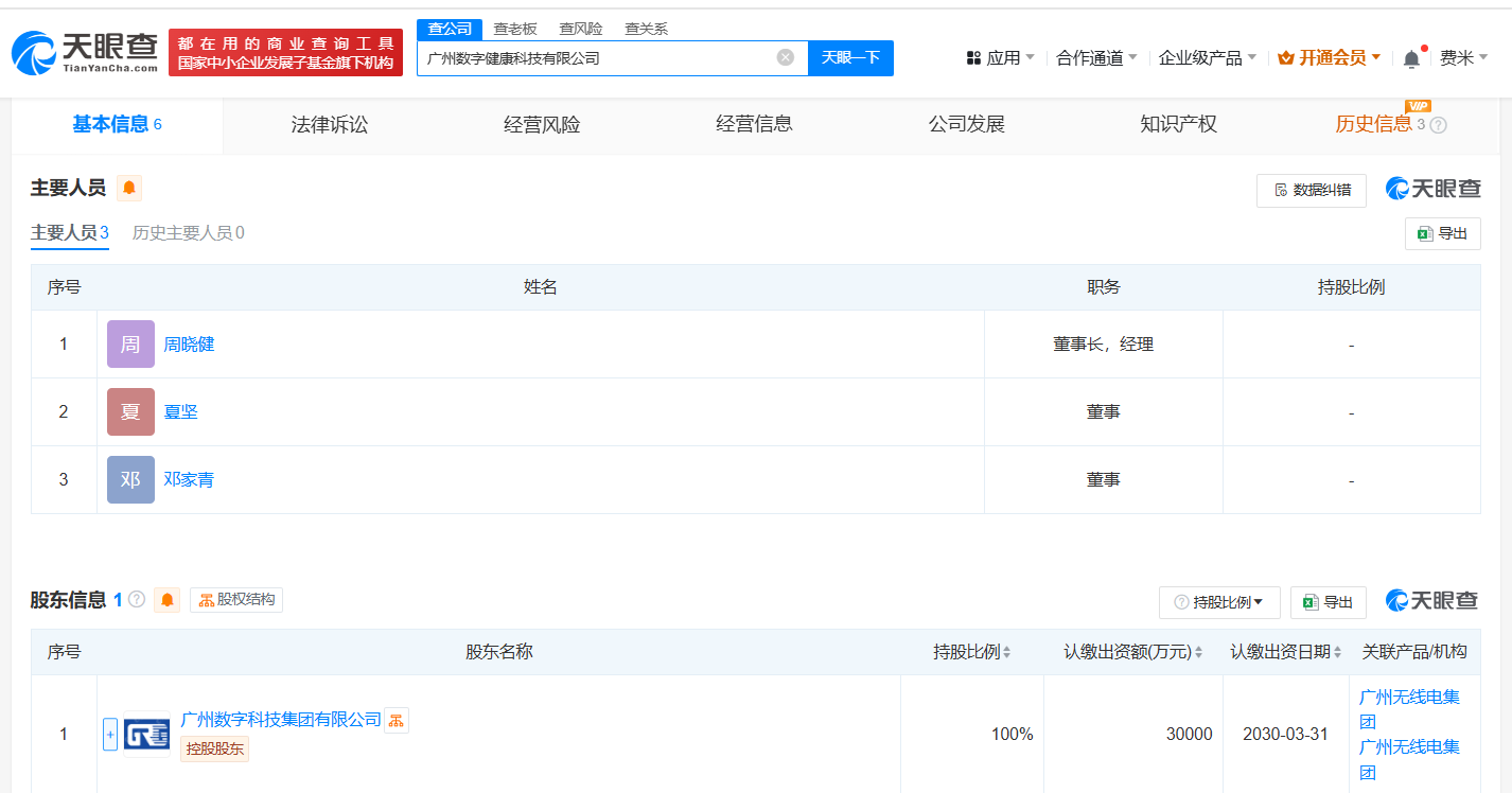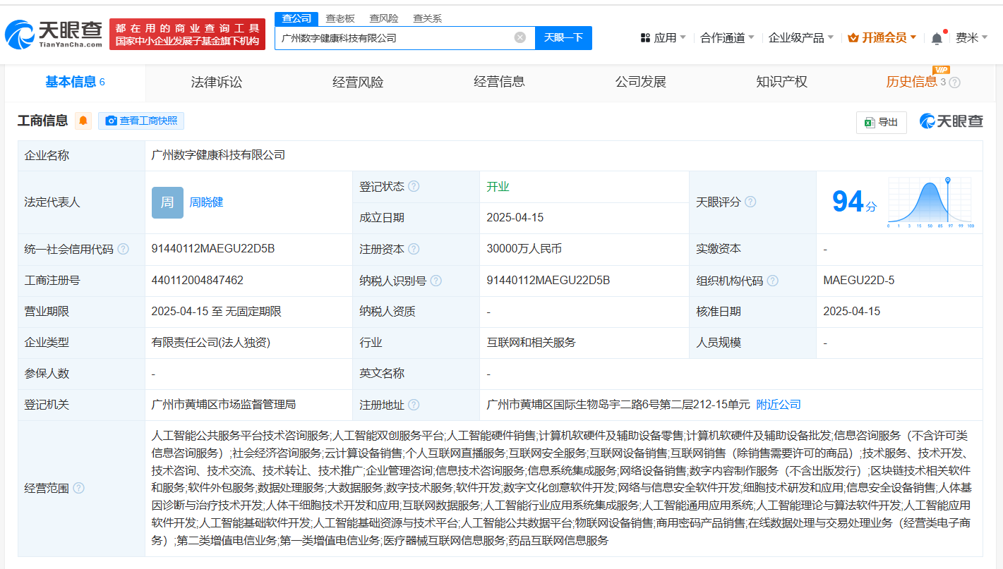 天眼查App显示,近日,广州数字健康科技有限公司成立,法定代表人为周晓健,注册资本3亿人民币,经营范围包括人工智能公共服务平台技术咨询服务、人工智能双创服务平台、人工智能硬件销售、社会经济咨询服务、云计算设备销售、个人互联网直播服务等,由广州数字科技集团有限公司全资持股。
