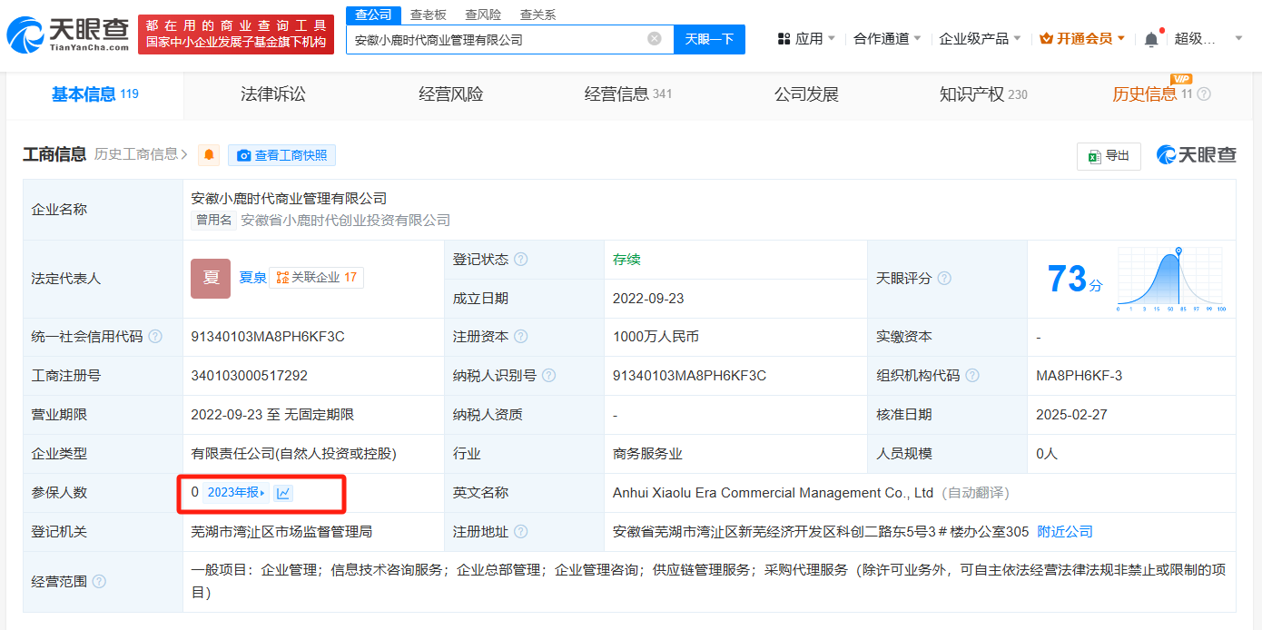 商业履历信息显示,小鹿妈妈创始人夏泉名下关联18家企业,其中14家为存续状态,包括安徽小鹿时代商业管理有限公司、安徽喜之家商业管理有限公司、芜湖小鹿妈妈生物科技有限公司等。夏泉在上述企业担任股东及法定代表人、执行董事、总经理等职务。值得注意的是,其名下的安徽小鹿时代商业管理有限公司、安徽吉鹿智能科技有限公司、芜湖市鹿龙生物科技有限公司等多家公司2023年年报显示参保人数均为0人。