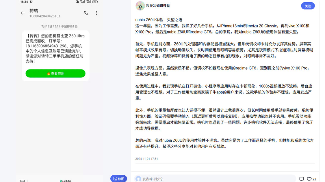 报告中也提到Z60 Ultra在系统便利性方面的不足,如验证码需手动输入(后续更新才支持直接复制)、应用推荐实用性低、震动功能偶发失效需重启恢复,以及在换机迁移数据时兼容性差,多数换机软件无法正常连接等问题。用户最终因体验不佳将Z60 Ultra在转转平台完成回收转出。