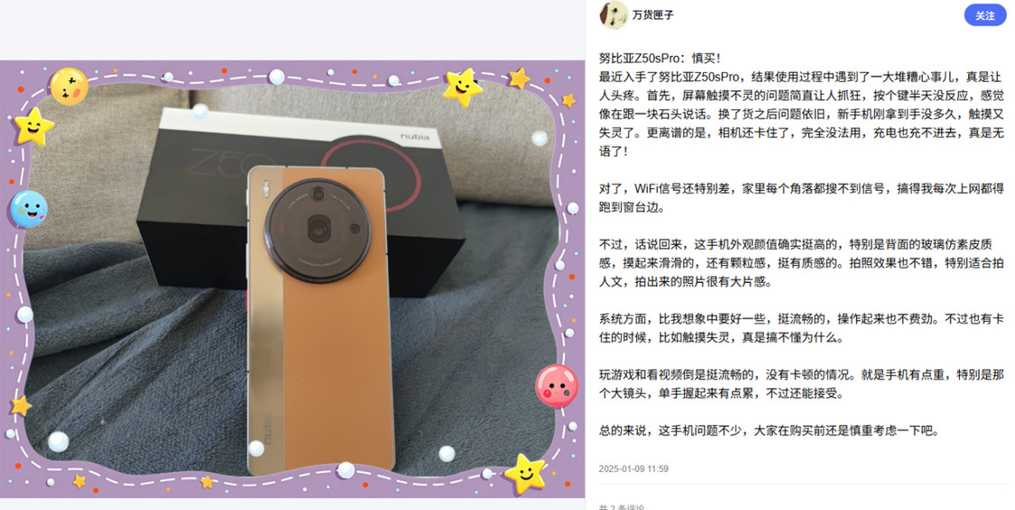 另一用户“万策瞳子”在2025年1月的反馈中也证实了类似问题,表示努比亚Z50s Pro的屏幕触摸不灵问题“简直让人抓狂”,换货后问题依旧存在。该用户同样遇到了相机卡住、充电问题以及WiFi信号差的情况,并无奈表示“家里每个角落都搜不到信号”。