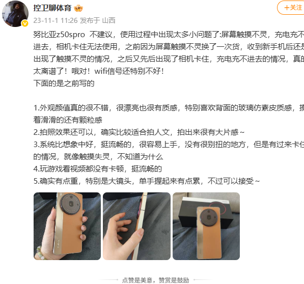 根据用户“控卫聊体育”2023年11月在社交平台发布的体验报告,努比亚Z50s Pro使用过程中出现了“太多小问题”,包括屏幕触摸不灵、充电充不进去、相机卡住无法使用等。该用户透露,此前曾因屏幕触摸不灵问题换过一次货,但收到的新手机仍然出现了触摸不灵的情况,之后又先后出现了相机卡住、充电充不进去的问题。此外,该用户还特别指出手机“wifi信号还特别不好”。