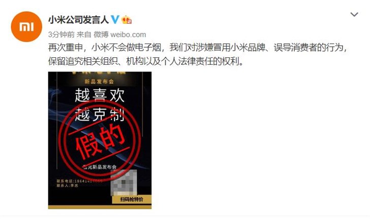 近日,有传闻称小米电子烟新品发布会将于5月21日在甚至举行,甚至还将类似发布会邀请函之类的东西放了出来;针对此事,小米公司再次辟谣,称“再次重申,小米不会做电子烟,我们对涉嫌冒用小米品牌、误导消费者的行为,保留追究相关组织、机构以及个人法律责任的权利。”