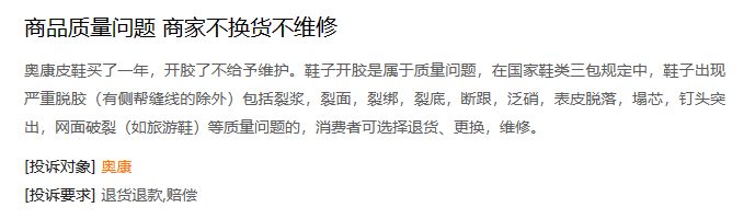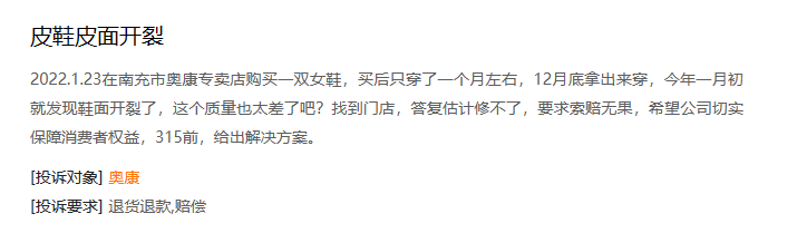 再者,能兼顾“产品”和“营销”的企业毕竟是少数,「螳螂观察」发现,在黑猫投诉,以“奥康”为关键字进行检索,不少的投诉集中在质量问题上,涉及“脱胶”“裂面”“售后消极”,严重影响了产品形象。