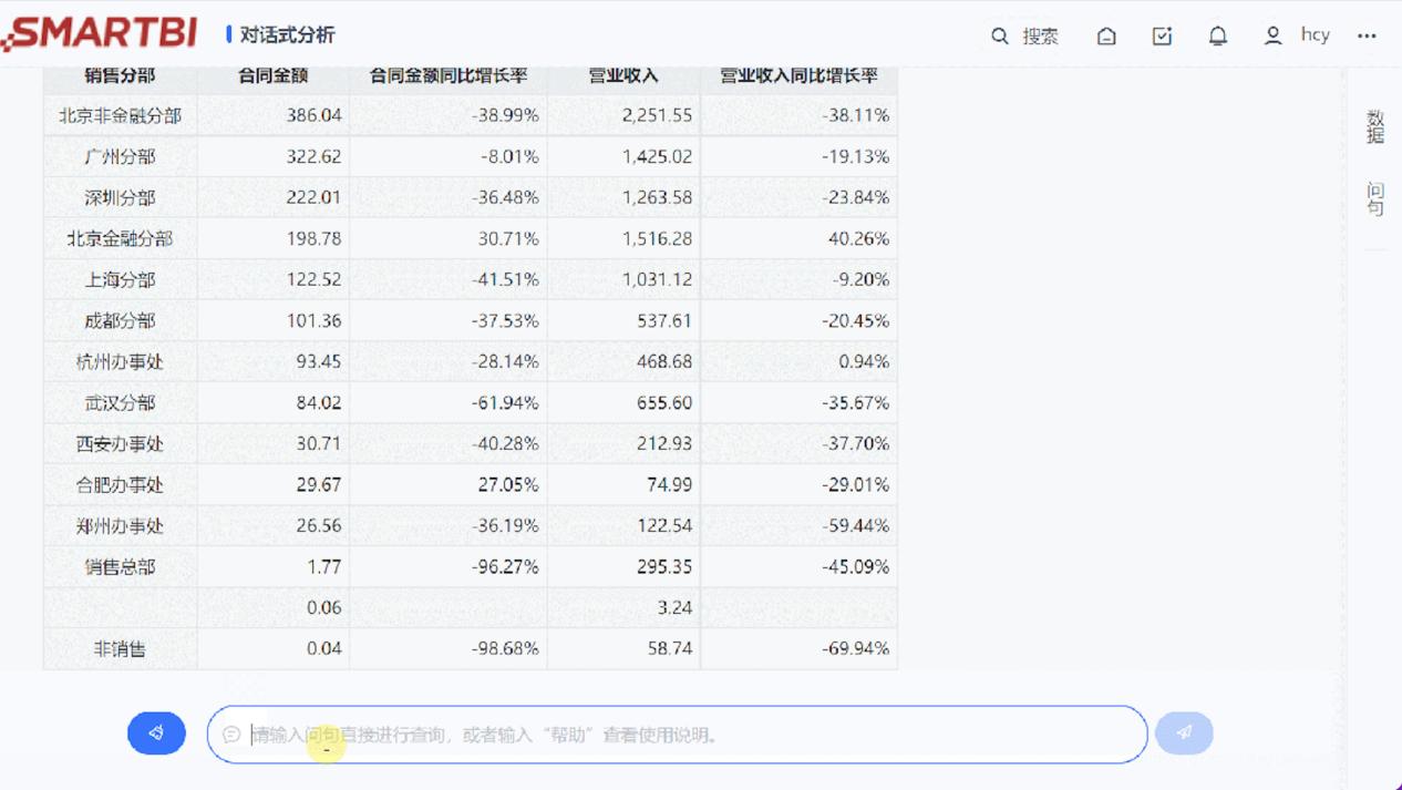 同时,有了一定的常识认知,Smartbi对话式分析大模型版本还能迅速理解“关于销售分部的”概念,并给出相应的纬度数据。