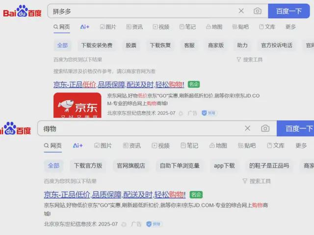 九年过去,百度搜索的广告竞价排名逻辑依然未能摆脱争议。实测发现,在百度搜索“拼多多”“得物”等关键词,首页首位却出现“京东”页面,右下角标注“广告”字样。
