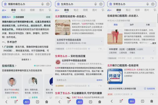 令人讽刺的是,唯独在百度搜索魏则西事件相关疾病“滑膜肉瘤怎么办”时,首页信息以专业科普为主,没有广告。而在搜索其他病症,例如“生病怎么办”“牙疼怎么办”等关键字时,首页充斥着医疗广告。