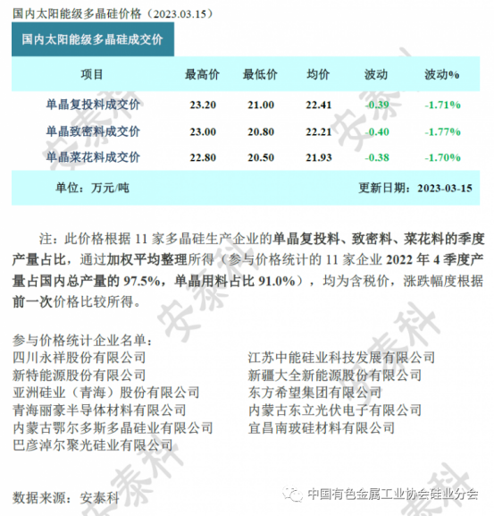 中国有色金属工业协会硅业分会数据显示,本周国内单晶复投料价格区间在21.0-23.2万元/吨,成交均价为22.41万元/吨,周环比降幅为1.71%;单晶致密料价格区间在20.8-23.0万元/吨,成交均价为22.21万元/吨,周环比降幅为1.77%。
