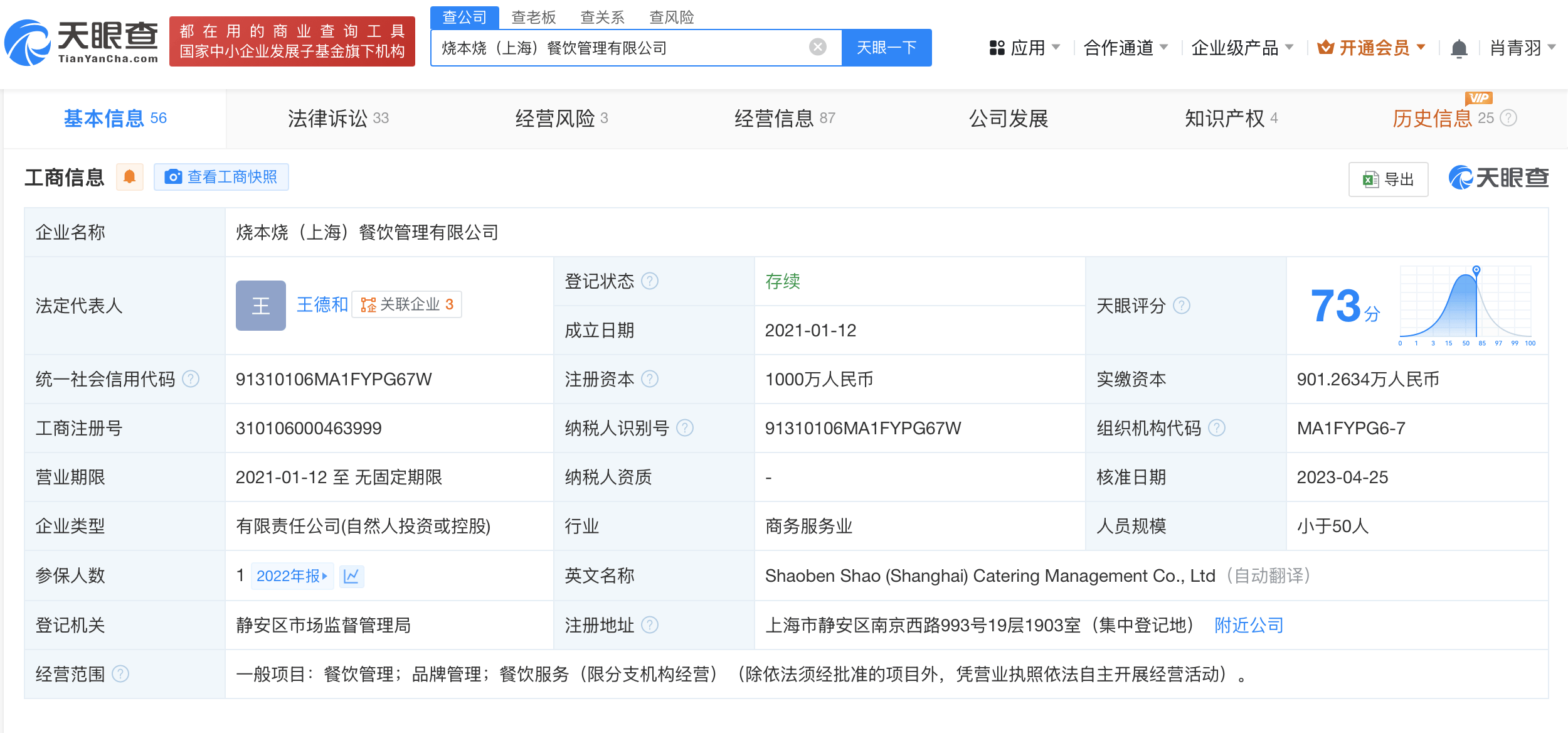 烧本烧(上海)餐饮管理有限公司成立于2021年1月,注册资本1000万,张翰曾持股10%,并于2023年4月退出。风险信息显示,该公司已关联破产案件,公开日期为2024年6月,申请人为南京众天下餐饮管理有限公司,经办法院为上海市第三中级人民法院。此外,该公司已被国家税务总局上海市静安区税务局列为非正常户,并于2024年7月被上海市静安区市场监督管理局列入经营异常名录。