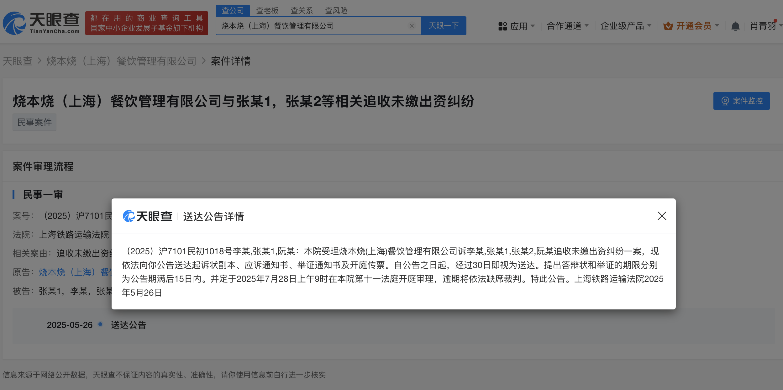天眼查App显示,近日,上海铁路运输法院向张翰等公告送达烧本烧(上海)餐饮管理有限公司与其追收未缴出资纠纷案件起诉状副本、应诉通知书等,自公告之日起30日即视为送达,并定于2025年7月28日开庭审理。