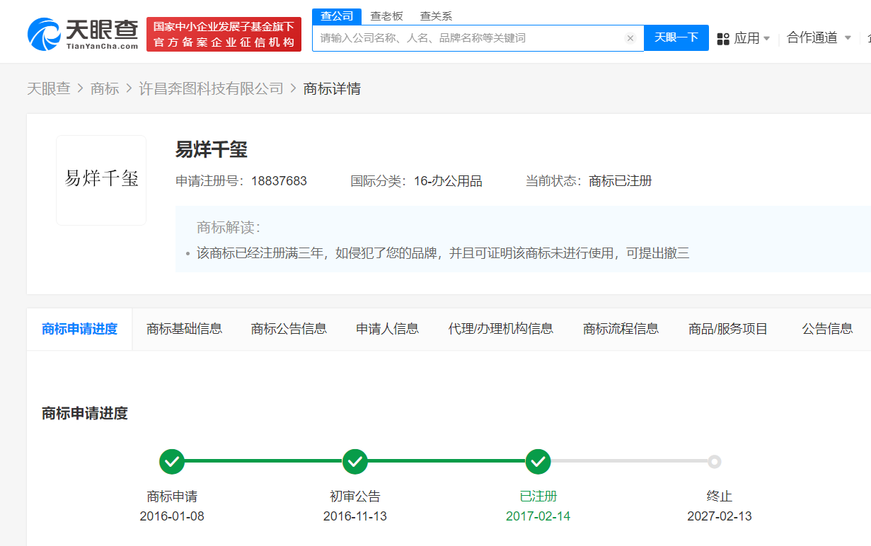 天眼查知识产权信息显示,“TFBOYS”曾被多方申请注册为商标,申请人除TFBOYS所在的北京时代峰峻文化艺术发展有限公司外,还包括多家公司及自然人等,国际分类包括广告销售、皮革皮具、服装鞋帽等,其中部分商标已注册成功。此外,“王俊凯”“王源”“易烊千玺”也均被申请注册为商标,国际分类涉及教育娱乐、办公用品、广告销售等,部分商标也已注册成功。