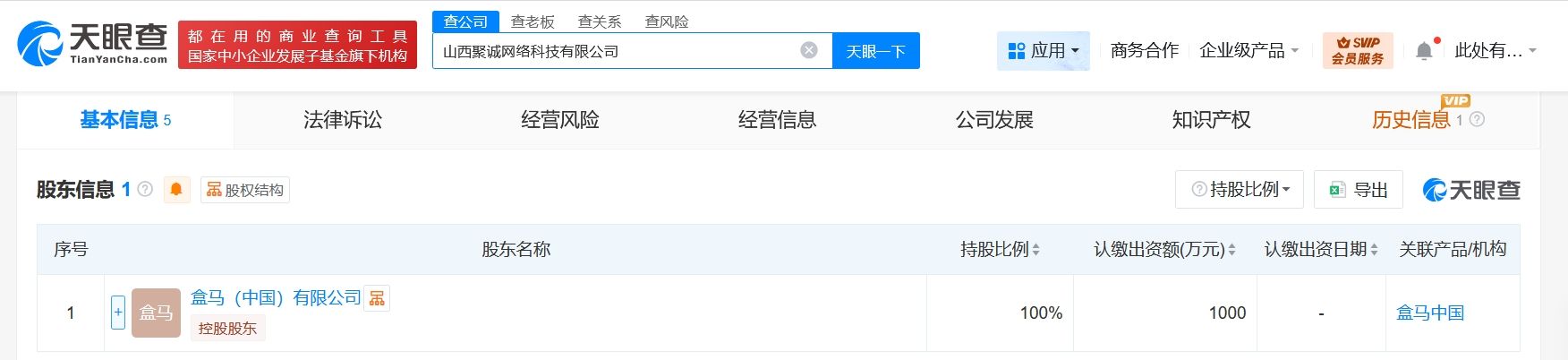 天眼查App显示,近日,山西聚诚网络科技有限公司成立,法定代表人为高强,注册资本1000万人民币,经营范围含餐饮服务、食品销售、日用家电零售、健康咨询服务、会议及展览服务、单用途商业预付卡代理销售、停车场服务、日用百货销售等,由盒马(中国)有限公司全资持股。