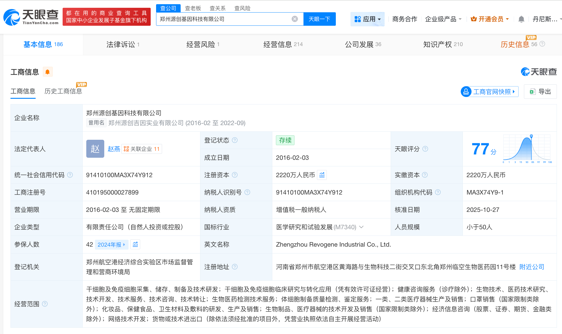 天眼查App显示,郑州源创基因科技有限公司成立于2016年2月,法定代表人为赵燕,注册资本2220万人民币,经营范围包括干细胞及免疫细胞采集、储存、制备及技术研发,干细胞及免疫细胞临床研究与转化应用等,由赵辉、睿佶(深圳)投资咨询合伙企业(有限合伙)、海南芙瑞沃投资有限公司等共同持股。知识产权信息显示,该公司多项专利被驳回,包括一种免疫细胞的冻存液及冻存方法、一种皮肤成纤维细胞的制备方法等。
