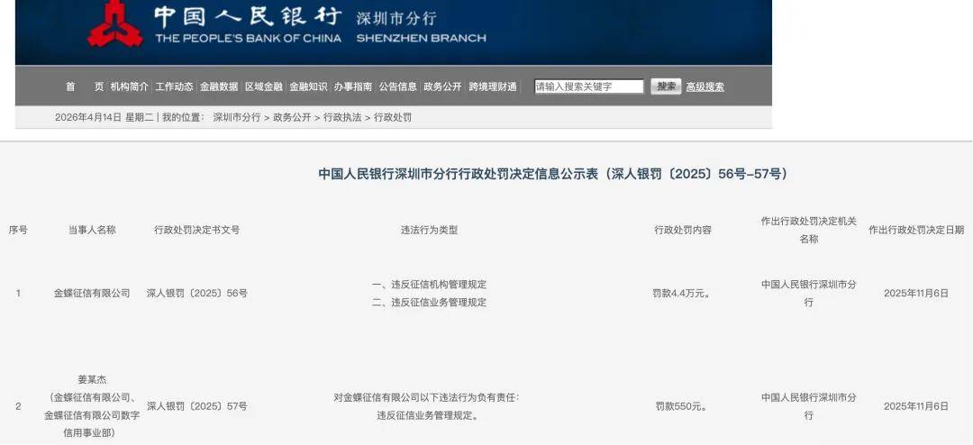 在追求云与AI转型的同时,金蝶还一直讲着“企业数据+信用+金融”的故事。征信业务,作为这一闭环中的关键一环,承载着金蝶对未来增长的无限遐想。然而,天眼查App显示,2025年11月,央行深圳分行给金蝶征信开出的一张4.4万罚单,却将金蝶的合规漏洞暴露无遗。