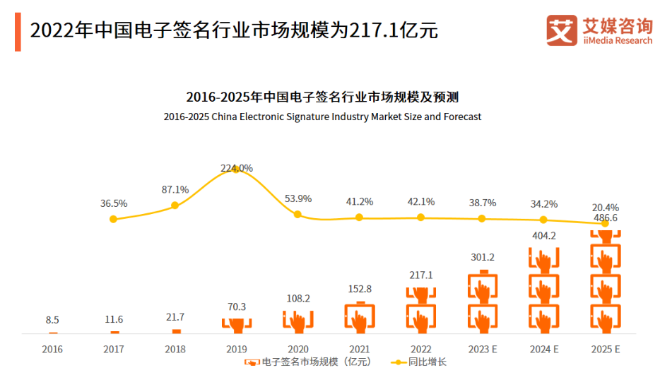 诚然,从行业发展速度来看,电子签名行业似乎一直都在风口之上。据艾媒数据显示,2022年中国电子签名行业市场规模为217.1亿元,同比增长42.1%,预计2025年有望达486.6亿元。