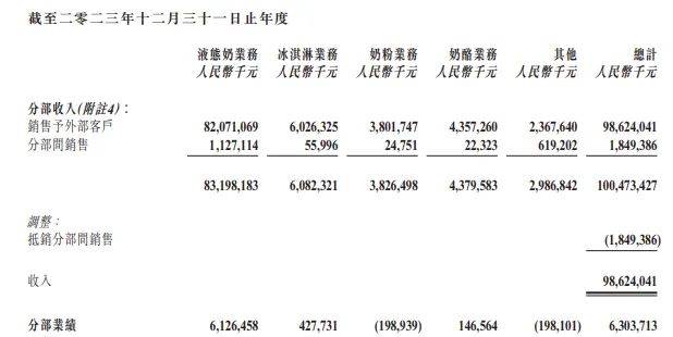 从分部业绩来看,液态奶实现利润61.26亿元,冰淇淋实现利润4.28亿元,奶粉亏损1.99亿元,奶酪实现利润1.47亿元。
