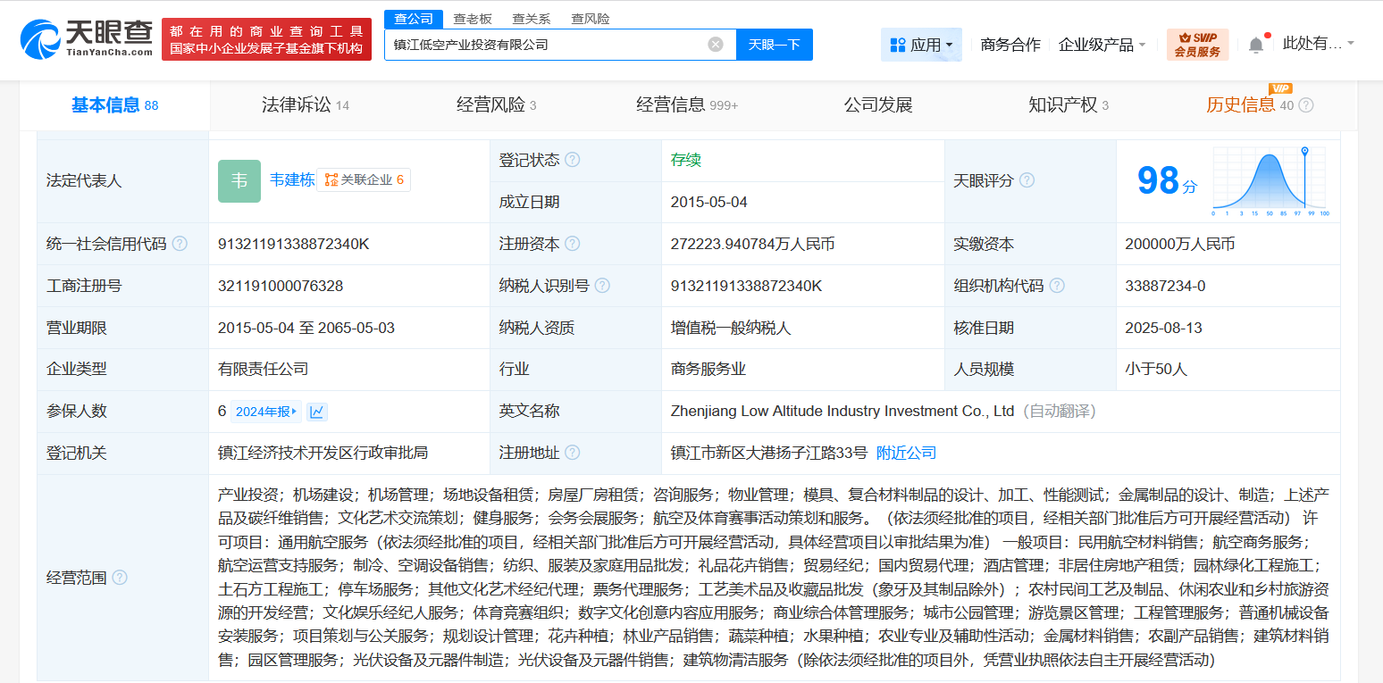 镇江低空产业投资有限公司成立于2015年5月,法定代表人为韦建栋,经营范围含产业投资、机场建设、机场管理、场地设备租赁、民用航空材料销售、航空商务服务、航空运营支持服务等。股东信息显示,该公司现由镇江产业发展控股集团有限公司及上述新增股东共同持股。
