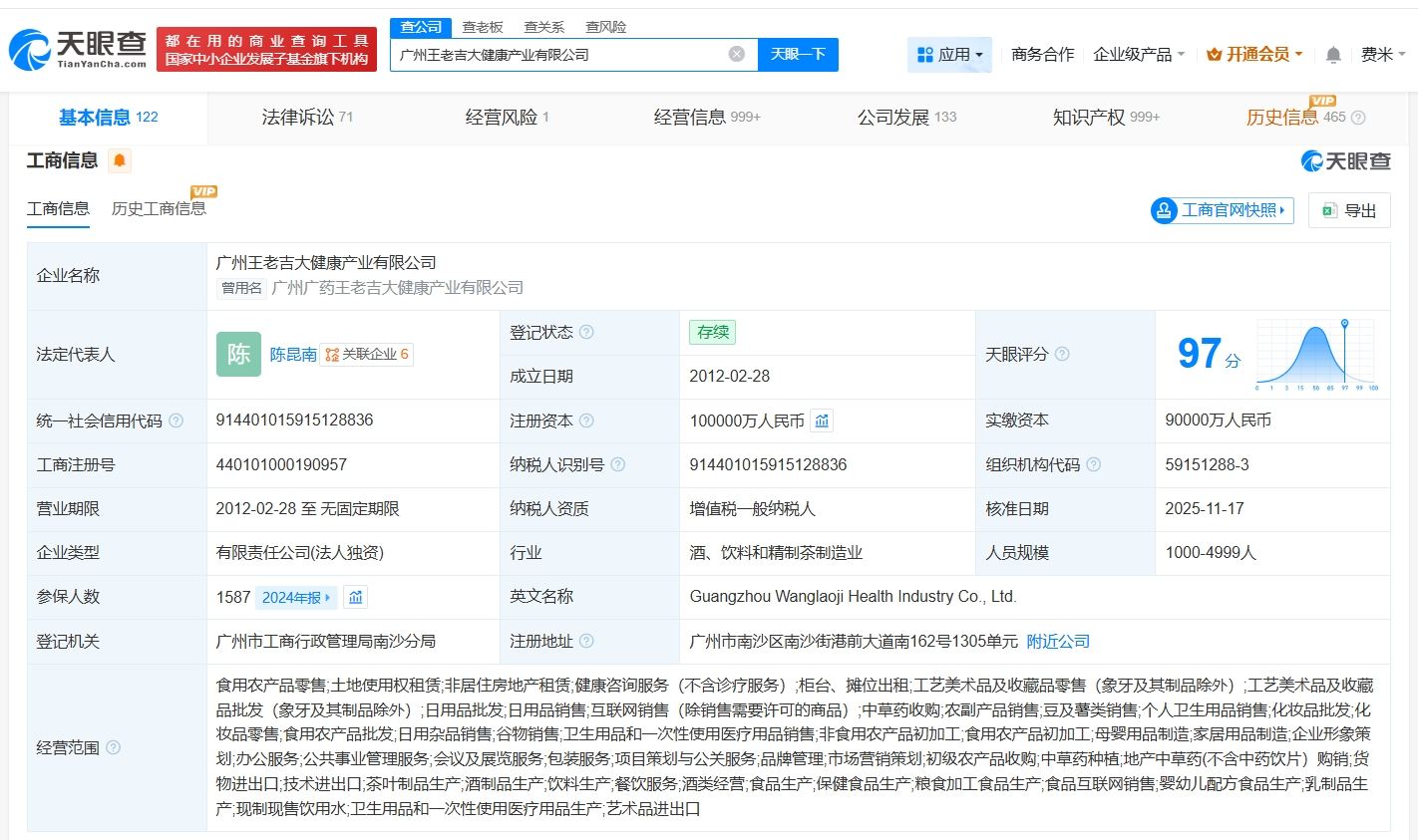 广州王老吉大健康产业有限公司成立于2012年2月,法定代表人为陈昆南,经营范围包括食用农产品零售、土地使用权租赁、非居住房地产租赁等。股东信息显示,该公司由白云山(600332)全资持股。