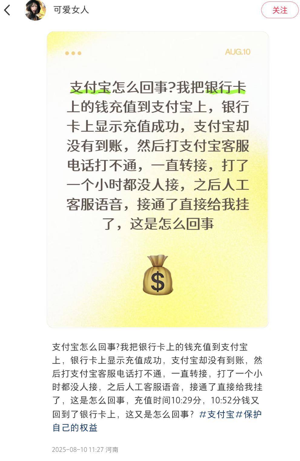 充值不到账的问题也屡见不鲜。一位用户表示,自己把银行卡上的钱充值到支付宝上,银行卡显示充值成功,可支付宝却毫无动静。着急的他拨打支付宝客服电话,却陷入了无尽的转接循环,打了一个小时都没人接。好不容易接通人工客服语音,却又被直接挂断。更离奇的是,充值时间10:29分,10:52分钱又回到了银行卡上,这让人不禁质疑支付宝的资金处理系统到底出了什么问题。