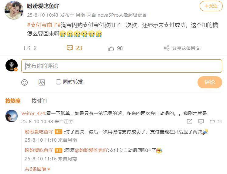 8月10日,支付宝崩了的消息如一颗重磅炸弹,瞬间登上热搜。部分网友反馈,在使用支付宝支付时遭遇了支付失败、充值长时间不到账的尴尬局面。有人满心欢喜地在淘宝闪购中挑选商品,付款时支付宝却扣了三次款,还显示未支付成功。这位网友无奈地表示,自己付了四次款,最后一次才不得不用微信支付成功,而支付宝只给退了两次款,多扣的钱何时能退回成了未知数。