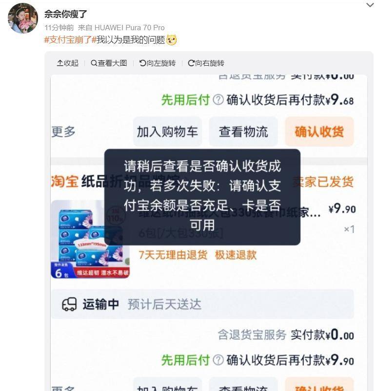 还有网友在淘宝支付页面收到提示:“请稍后查看是否确认收货成功,若多次失败:请确认支付宝余额是否充足、卡是否可用。”这看似贴心的提示,背后却是用户无法顺利完成支付的焦急与无奈。更有网友愤怒地喊话支付宝:“不是支付宝你搞什么啊?自己钱不让用,余额不让用了?成你的了呗?”