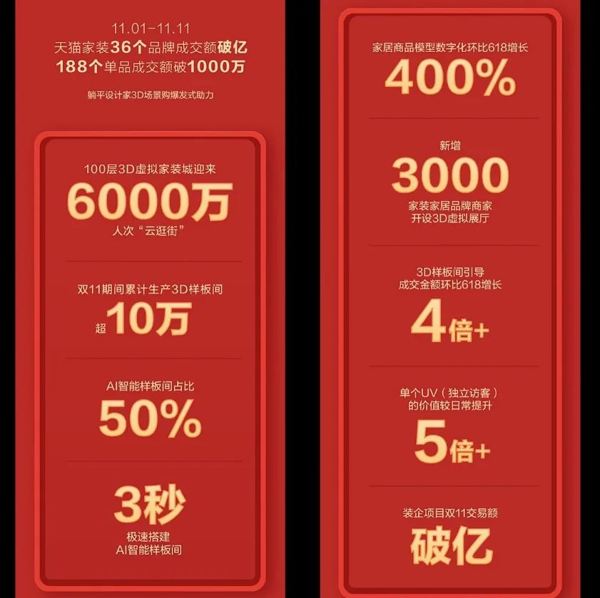 今年双11,天猫3D场景购迎来爆发式增长。在躺平设计家助力下,双11期间累计生产3D样板间超10万个,设立3D虚拟展厅的商家新增3000多家,天猫100层3D虚拟家装城迎来6000万人次“云逛街”。