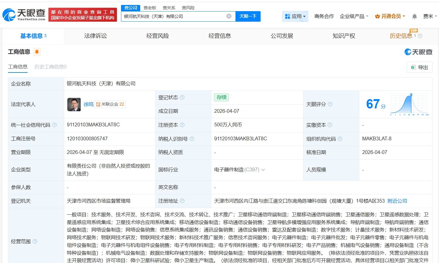 天眼查App显示,近日,银河航天科技(天津)有限公司成立,法定代表人为徐鸣,注册资本500万人民币,经营范围包括卫星移动通信终端制造、卫星移动通信终端销售、卫星通信服务等,由银河航天(北京)科技集团股份有限公司全资持股。